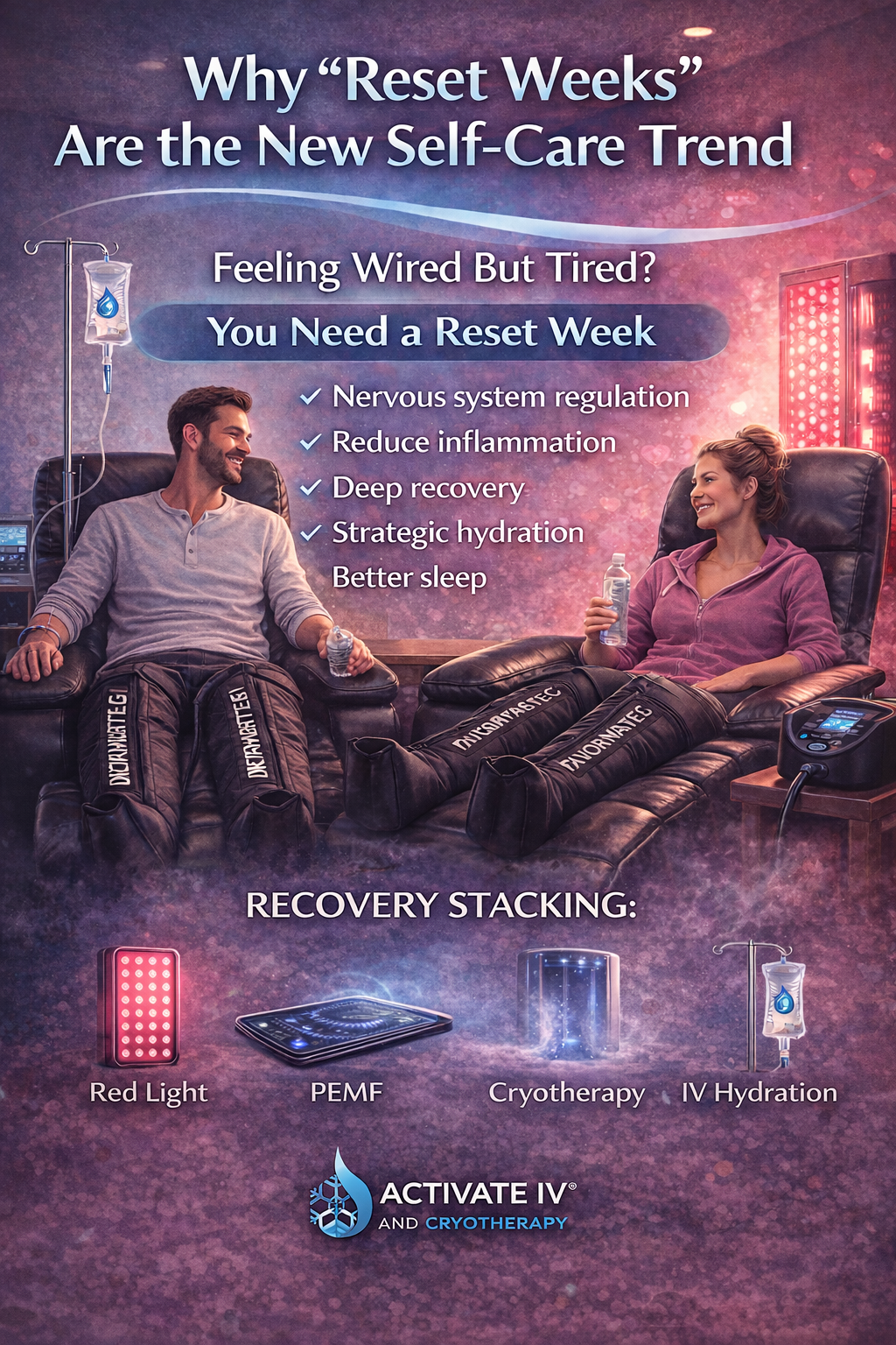 Indulge in 3 sessions of combo therapy with our Multi-Service Special. Enjoy Full-Body Cryotherapy, Red Light Therapy, and Compression Therapy for just $99.